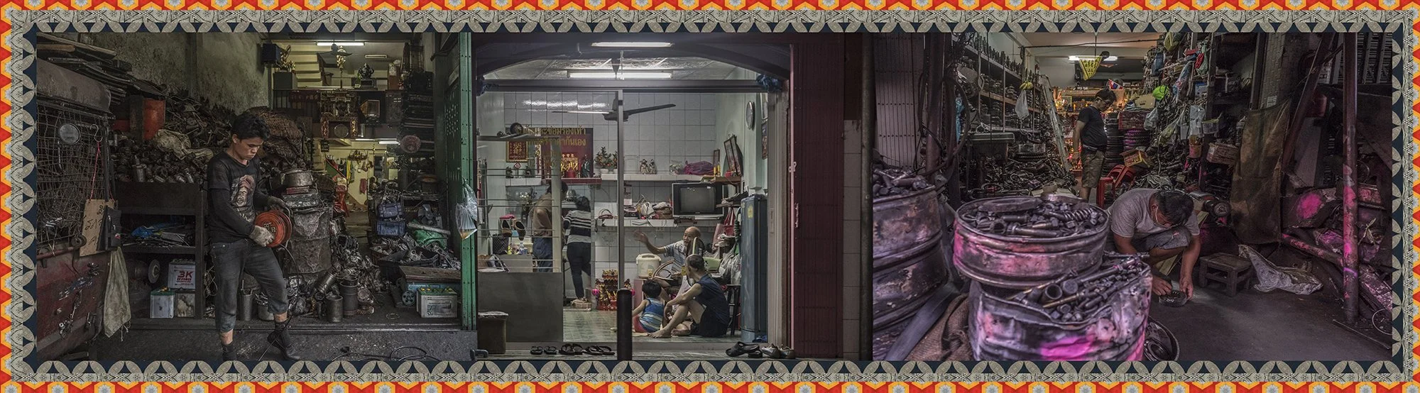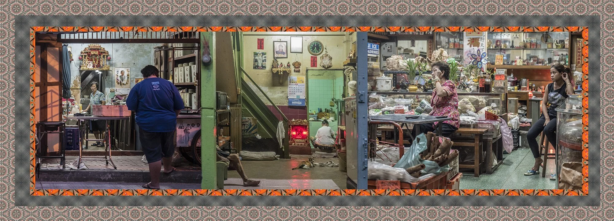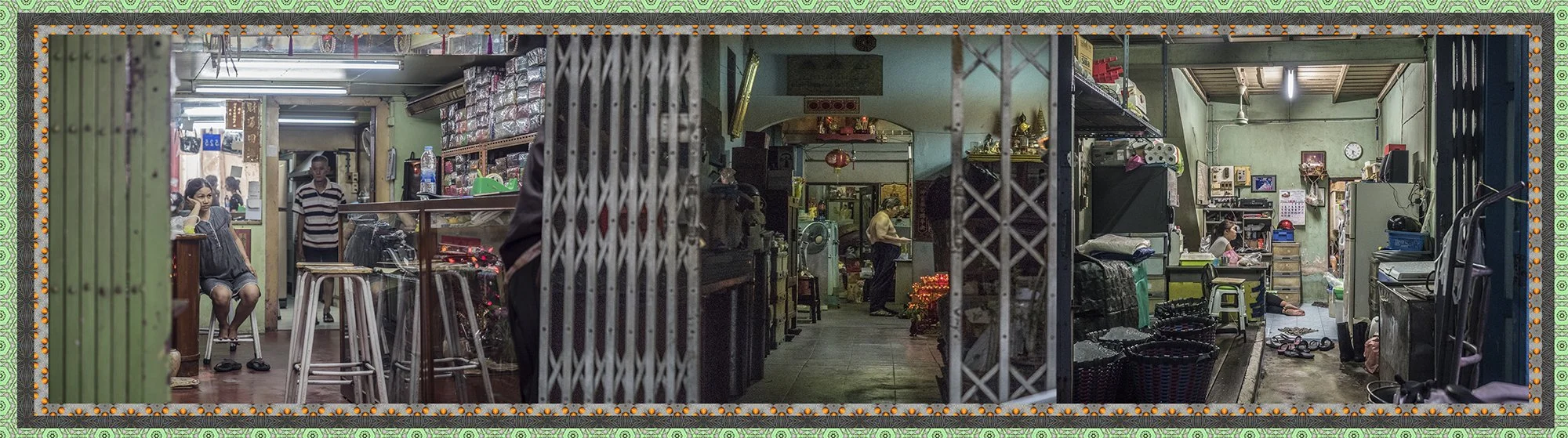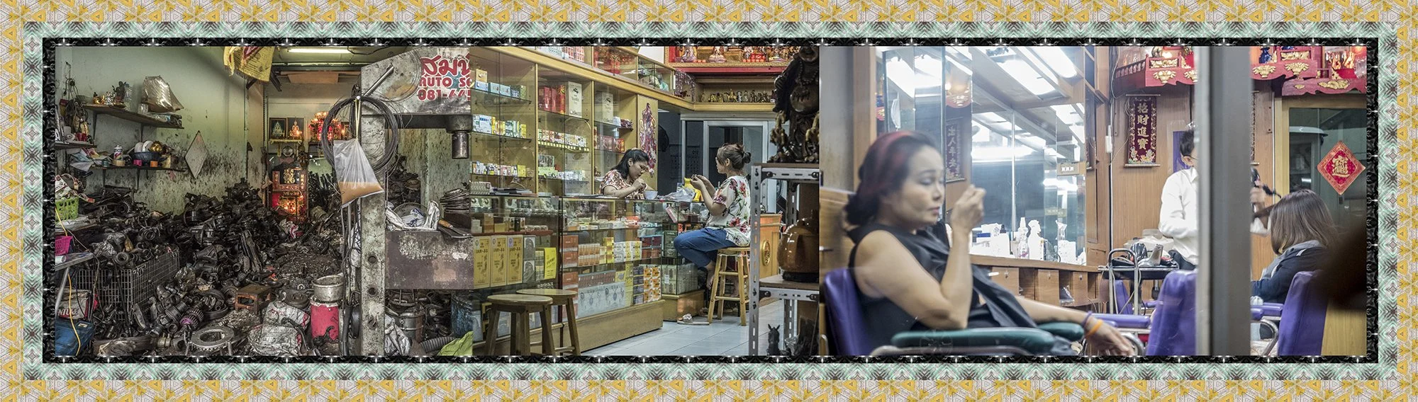 Avec l’autorisation des habitants, j’ai photographié ces échoppes de manière frontale, sans artifice, et composé des collages juxtaposant trois boutiques distinctes afin de restituer la sensation d’accumulation, de fragmentation et d’écrasement du regard vécue lors de mes déambulations. Ce procédé évoque le regard occidental qui, dans la rapidité de l’observation, fusionne ces scènes en un seul tableau.