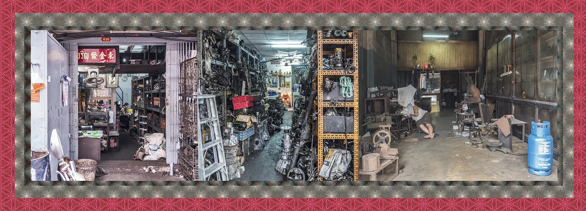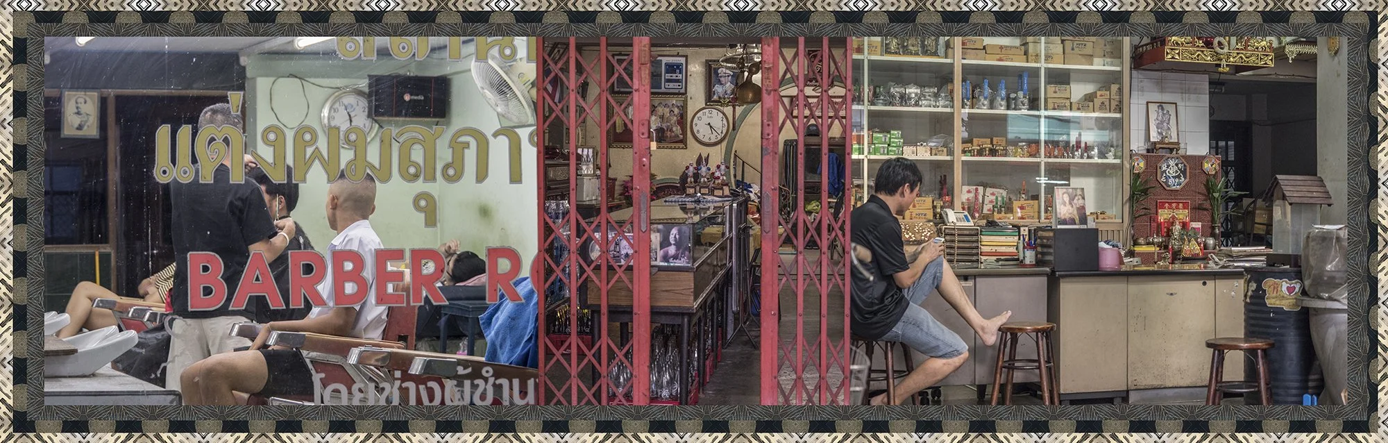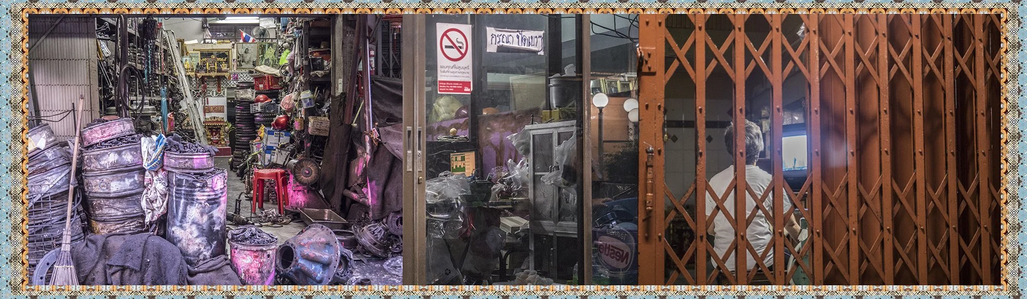 Avec l’autorisation des habitants, j’ai photographié ces échoppes de manière frontale, sans artifice, et composé des collages juxtaposant trois boutiques distinctes afin de restituer la sensation d’accumulation, de fragmentation et d’écrasement du regard vécue lors de mes déambulations. Ce procédé évoque le regard occidental qui, dans la rapidité de l’observation, fusionne ces scènes en un seul tableau.