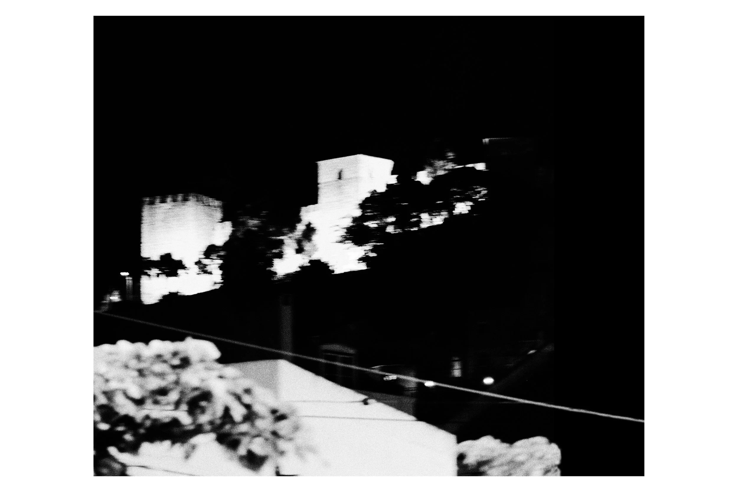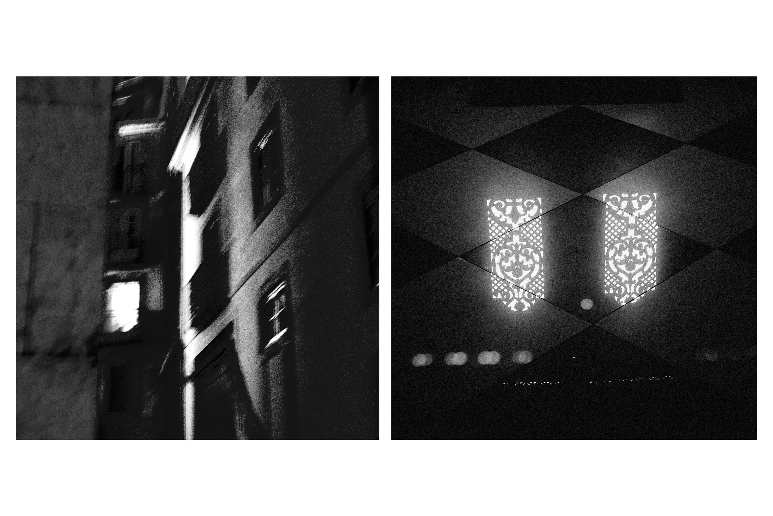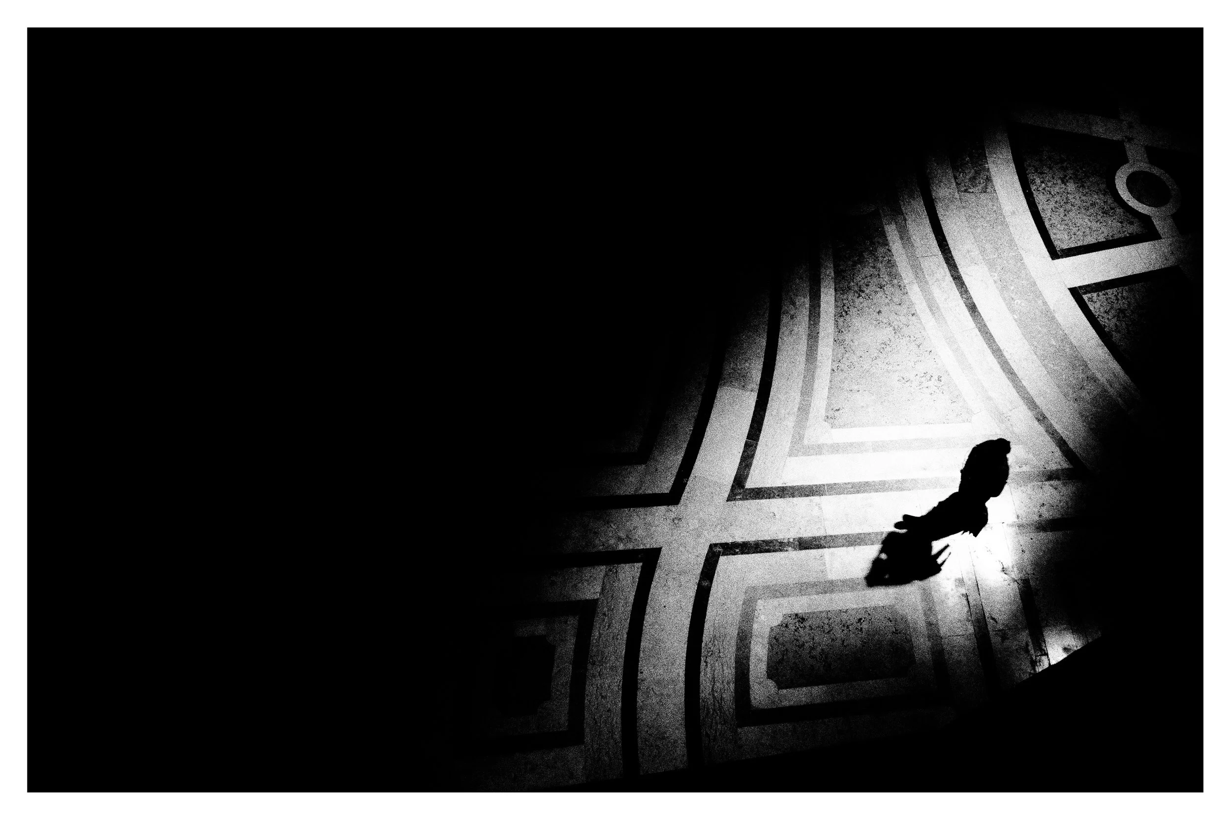 Je choisis de photographier en noir et blanc et d’utiliser un noir profond, presque absolu comme un outil de sélection, d’extraction, qui me permet d'éliminer le superflu, de redéfinir les contours, de concentrer le regard sur l'essentiel : un détail, un reflet, un faisceau lumineux. Le rythme d'apparition des images dans la série suit celui de la promenade urbaine : une alternance de lenteur contemplative et de vitalité chaotique. Par moments, des flous de bougé s'invitent dans l'image. Ce ne sont pas des accidents techniques, mais des témoins fidèles de l'émotion physique du moment. L'appareil photo devient sismographe, enregistrant les vibrations de la ville et celles de mon propre corps en mouvement.